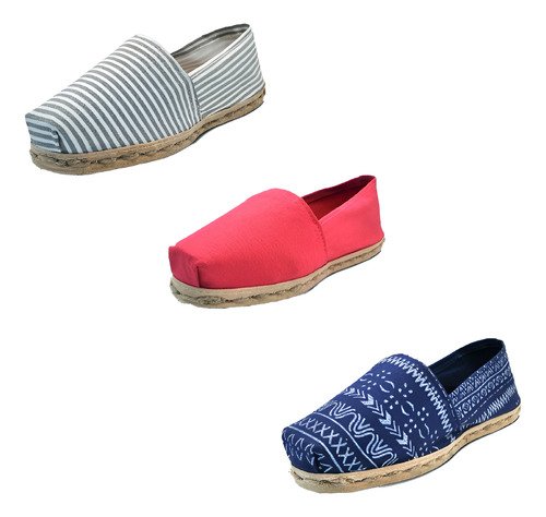 TriPack de alpargata iberia con modelos ray gris/blan, terracota, azul étnico con un rango de talla de 34 a 39.