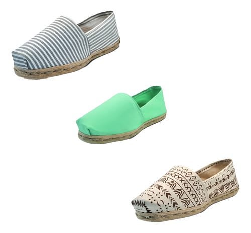 TriPack de alpargata iberia con modelos ray gris/blan, turquesa, crudo étnico con un rango de talla de 34 a 39.