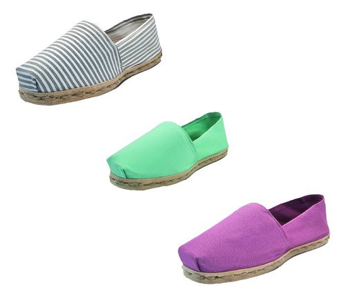 TriPack de alpargata iberia con modelos ray gris/blan, turquesa, jacarandá con un rango de talla de 34 a 39.
