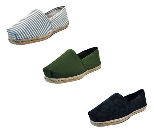 TriPack de alpargata iberia con modelos ray gris/blan, verde militar y animal print negro con un rango de talla de 34 a 39.