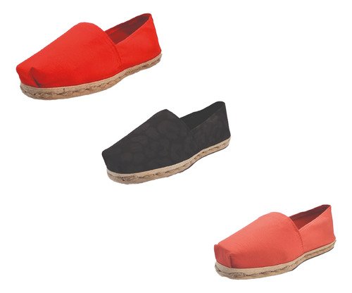 TriPack de alpargata iberia con modelos rojo, animal print negro y terracota con un rango de talla de 34 a 39.