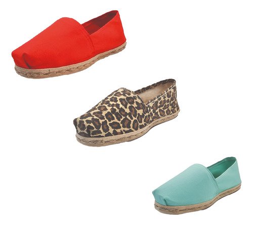 TriPack de alpargata iberia con modelos rojo, animal print y turquesa con un rango de talla de 34 a 39.