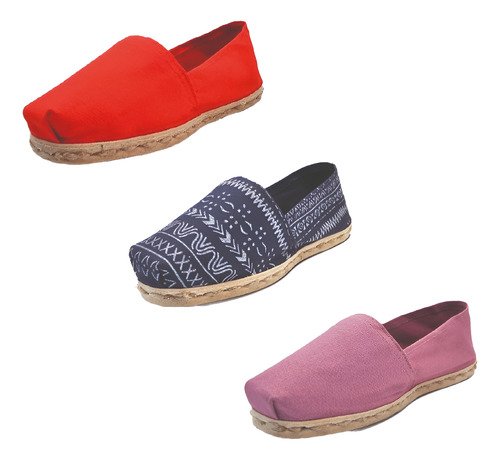TriPack de alpargata iberia con modelos rojo, azul étnico y jacarandá con un rango de talla de 34 a 39.