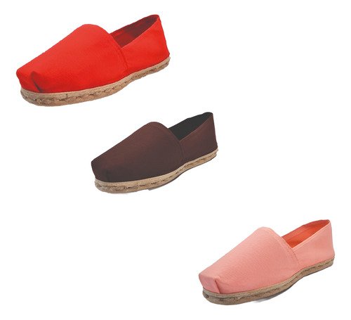 TriPack de alpargata iberia con modelos rojo, café y coral con un rango de talla de 34 a 39.