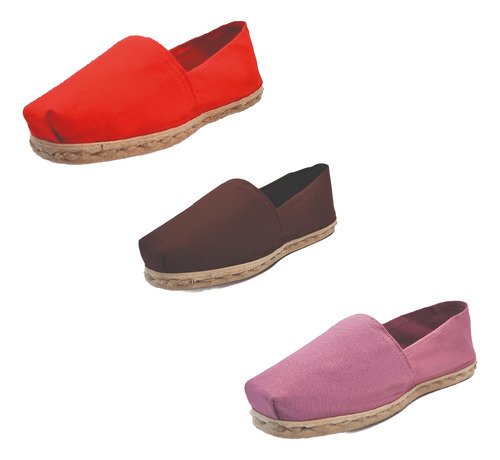 TriPack de alpargata iberia con modelos rojo, café y jacarandá con un rango de talla de 34 a 39.