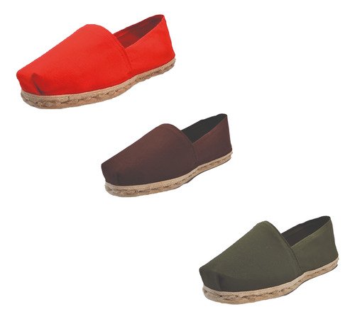 TriPack de alpargata iberia con modelos rojo, café y verde militar con un rango de talla de 34 a 39.