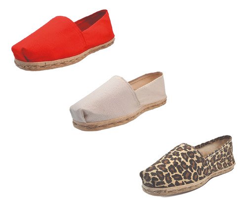 TriPack de alpargata iberia con modelos rojo, crudo y animal print con un rango de talla de 34 a 39.